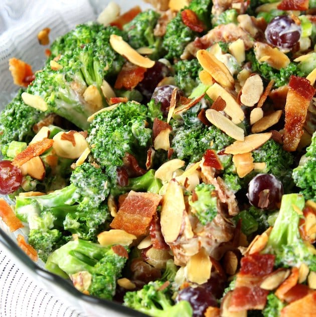 With blanched broccoli, red grapes, sliced almonds, green onions, yummy bacon, and the most delicious creamy dressing!